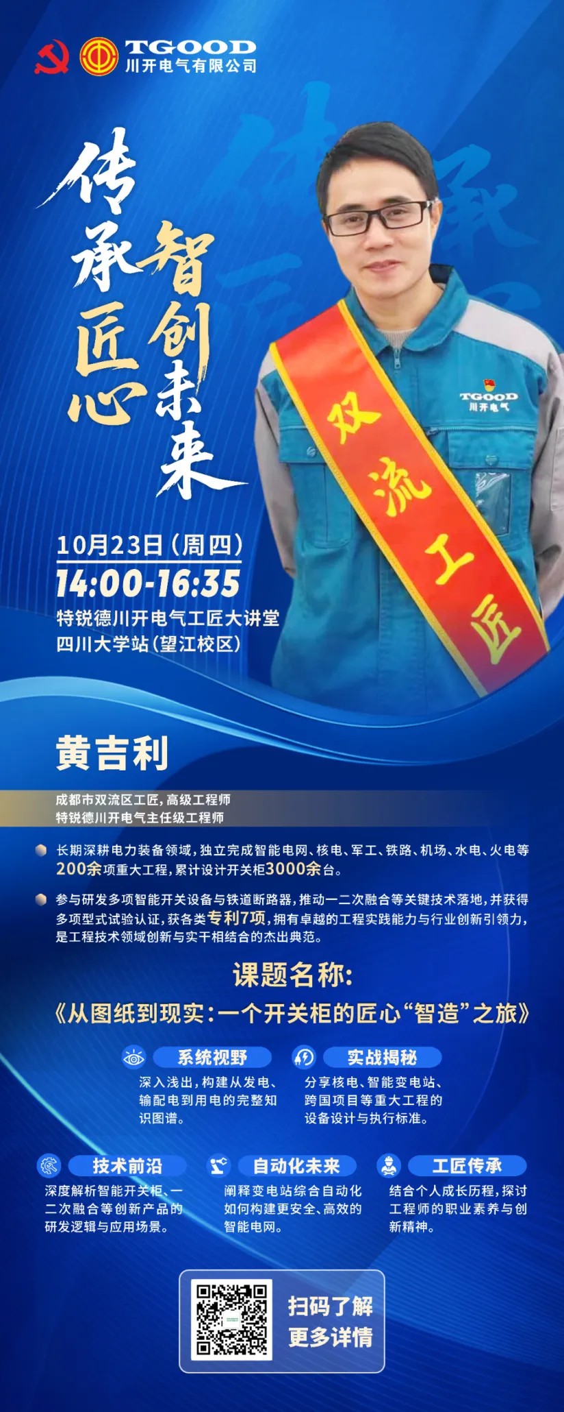 10月23日,以“傳承匠心 智創(chuàng)未來(lái)”為主題的特銳德川開(kāi)電氣45周年工匠大講堂在四川大學(xué)電氣工程學(xué)院首站啟幕,黨員先鋒代表、雙流工匠、特銳德川開(kāi)電氣技術(shù)高級(jí)工程師黃吉利為學(xué)院近60名2022屆本科生帶來(lái)了《從圖紙到現(xiàn)實(shí):一個(gè)開(kāi)關(guān)柜的匠心“智造”之旅》工匠講堂。